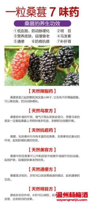 桑椹酒是一種新興的果酒,它是水果酒之中的極品,具有滋補、養身及補血之功效。 飲用后,不但可以改善女性手腳冰冷毛病,更有補血、強身、益肝、補腎、明目等功效。早晚飲用效果更佳。桑椹酒能讓你喝出品味,喝出健康,喝出迷人豐采。