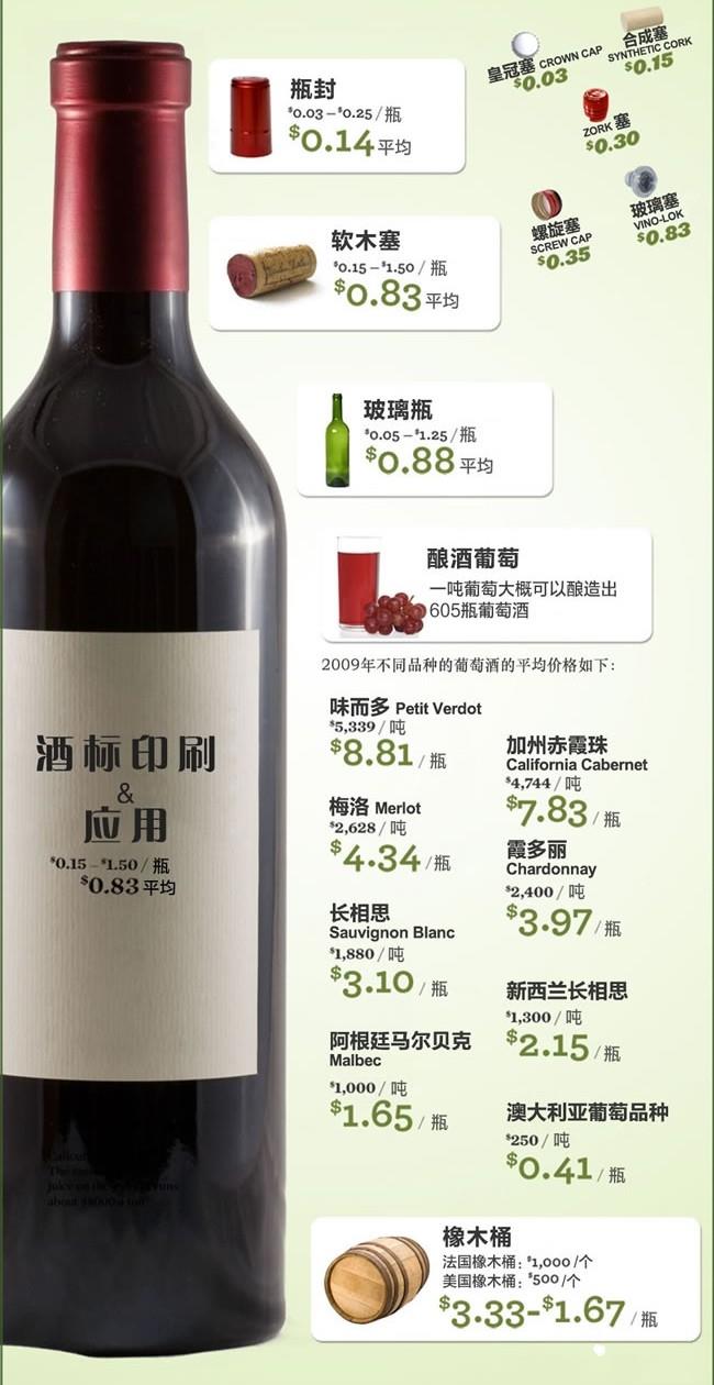 一般來(lái)說(shuō),性價(jià)比高的葡萄酒是指其價(jià)格絕大部分來(lái)源于生產(chǎn)成本的葡萄酒。葡萄酒的生產(chǎn)成本包括哪些呢?下面的圖片詳細(xì)地介紹了一瓶葡萄酒的各個(gè)部分分別需要多少成本。